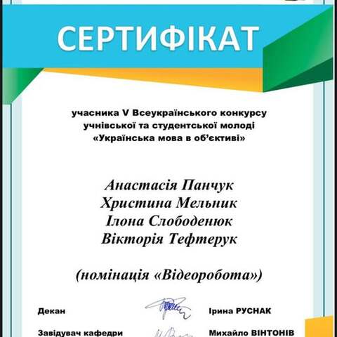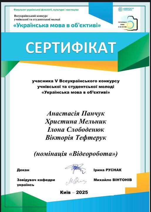 Здобувачі освіти нашого коледжу — Анастасія Панчук, Христина Мельник, Ілона Слободенюк та Вікторія Тефтерук — взяли участь у V Всеукраїнському конкурсі учнівської та студентської молоді «Українська мова в об’єктиві» у номінації «Відеоробота»